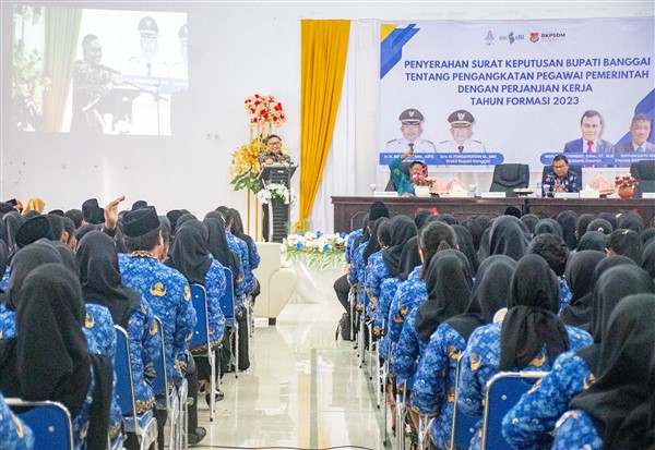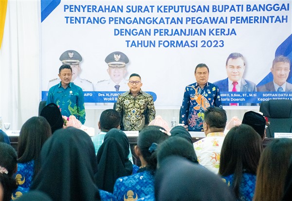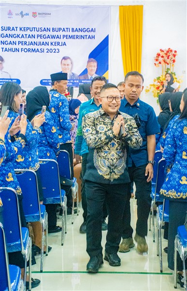 LUWUK-portalbanggai.com (05/07/2024). Bupati Banggai Ir. H. Amirudin, M.M. mengukuhkan PPPK sekaligus menyerahkan secara simbolis SK Pengangkatan PPPK di Gedung Aula BKPSMD Kabupaten Banggai pada Kamis (04/07/2024). Hal ini menjadikan jumlah ASN di Pemerintah Kabupaten Banggai, sudah termasuk PNS ditambah dengan PPPK yang sudah diangkat secara resmi sampai hari ini, update data di BKPSDM berjumlah 8.928 ASN, dengan rincian PNS berjumlah 6315 dan PPPK berjumlah 2613.